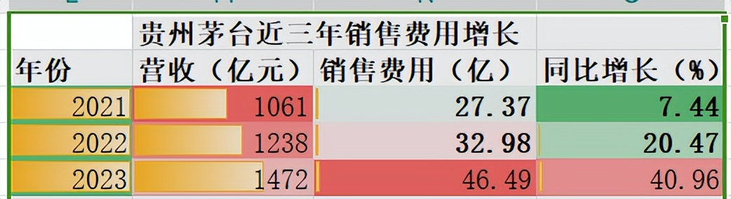 作为两市白酒龙头,贵州茅台(600519.SH)的营销费用占比与增速,以往都比较低,排在行业后列。不过,这两年,这家公司的营销费用增速大幅增长,2022年达到20.47%,2023年竟然高达40.97%。