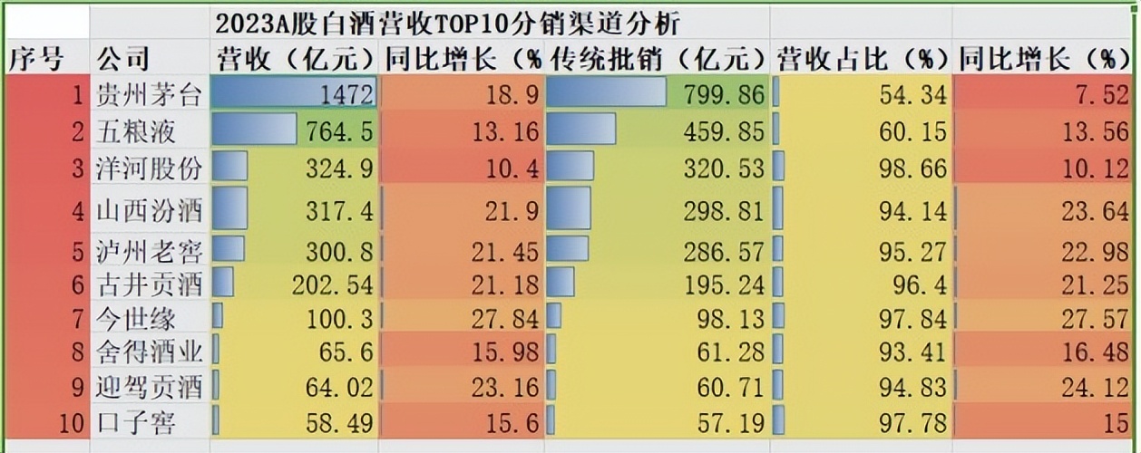 其中,贵州茅台最低,传统批销占比仅54.34%(这里,所用数据为渠道营收对公司白酒收入占比,排除了其他非白酒收入,因此,与年报相关数据略有不同)。而且,贵州茅台传统批销收入当年同比增长仅7.52%,在TOP10中也是最低的。