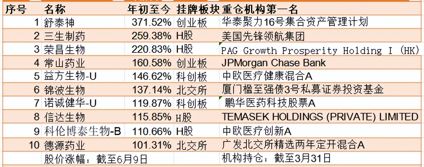 不过,受披露时间影响,部分个股股东数据不全,比如上述的健康之路。这里,公司研究室将今年1季度末机构持股数据披露的个股,按照涨幅前10列表如下。