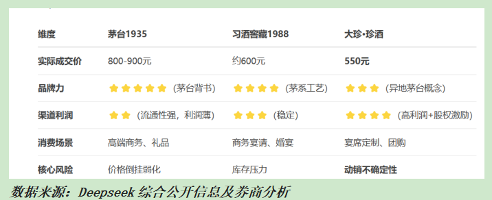 Deepseek分析称,习酒1988凭借“茅系勾调工艺”和更柔顺的口感,被广泛认可为“小飞天”,市场接受度更高;珍酒虽有“异地茅台”历史背书,但近年工艺升级滞后,口感被认为略逊于茅台核心产区产品。