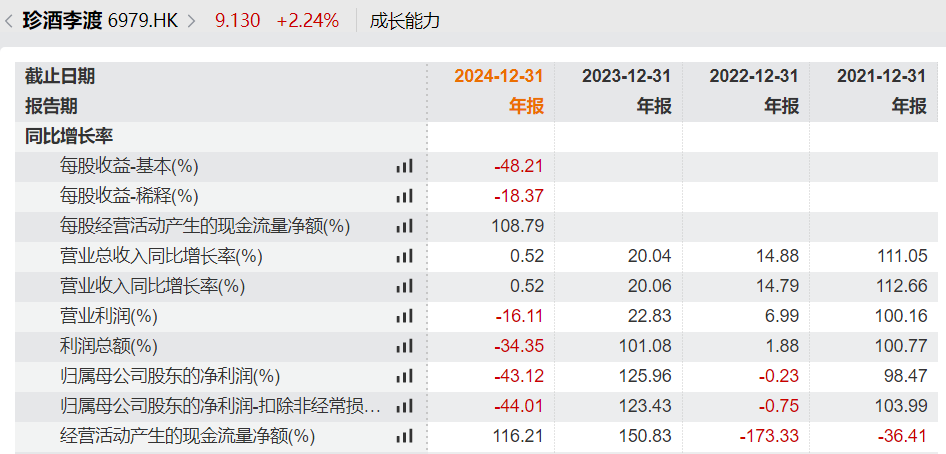 至于珍酒李渡,上市以来零分红。年报显示,珍酒李渡2024年营收增速从前年的20.06%降至0.52%,净利润暴跌43%。