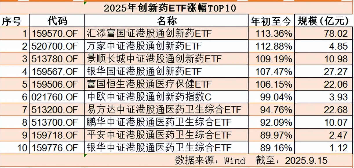 其余涨幅超过100%的ETF,分别是:万家中证港股通创新药ETF,112.88%;景顺长城中证港股通创新药ETF,109.19%;银华国证港股通创新药ETF,107.47%;富国恒生港股通医疗保健ETF,106.15%。