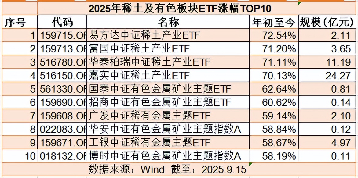 Wind数据显示,稀土及有色金属产业位居ETF年内涨幅第五阵营。