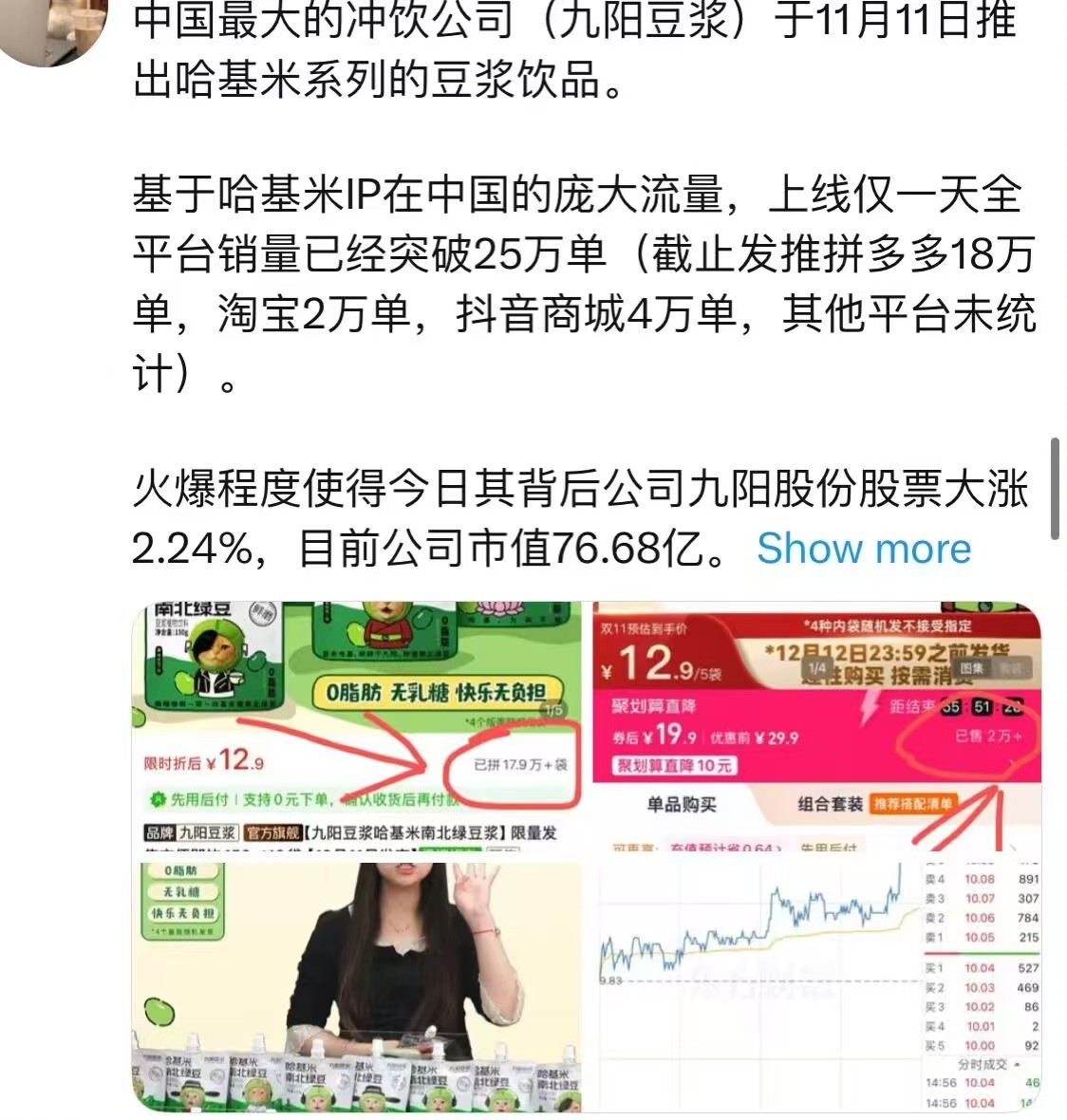 而背后涨停的原因,是因为九阳豆浆新推出一个产品,叫哈基米南北绿豆浆。