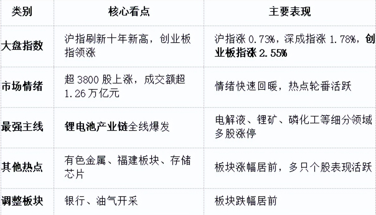今天市场是一个典型的 “成长赛道驱动” 行情。锂电池板块的爆发,一方面可能源于行业基本面改善的预期(如六氟磷酸锂等产品涨价),另一方面也说明在经过一段时间的震荡后,资金重新开始关注高增长潜力的板块。