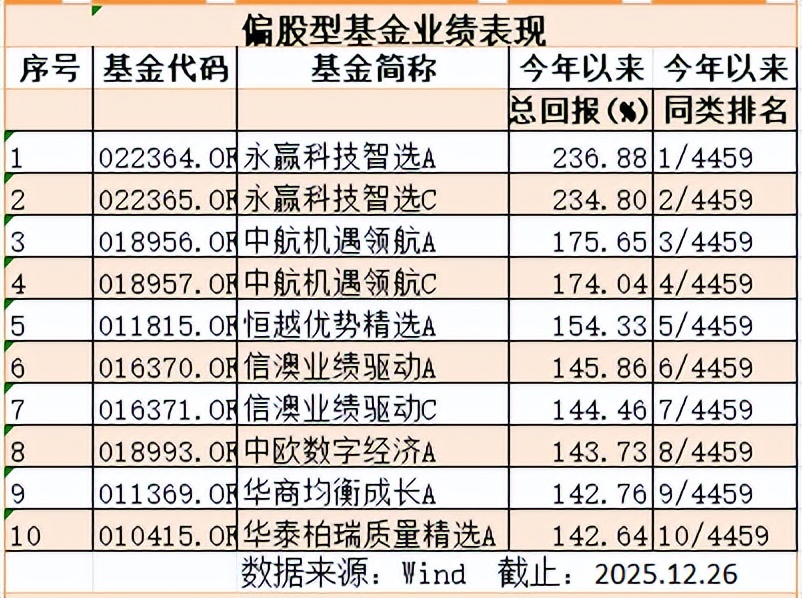 Wind数据显示(下同),2025年净值增长最好的权益品类,就是偏股混合型基金。截至12月26日收盘(下同),沪深两市偏股混合型基金总计5108只,其中有可比数据的4459只(同一基金的A、C类产品分别计算)。