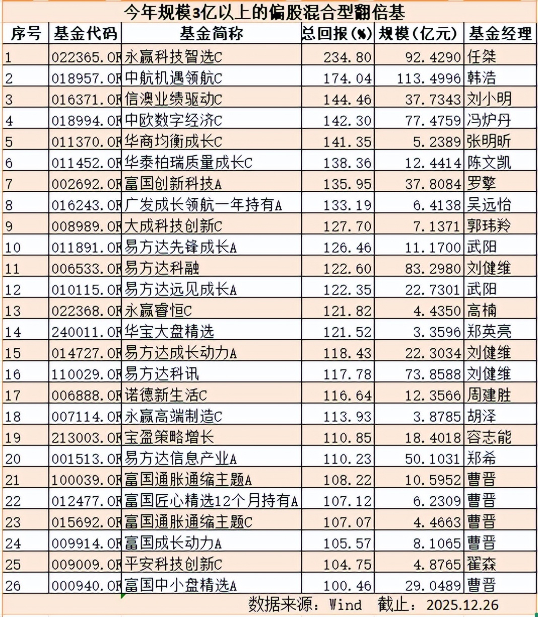 数据显示,今年以来涨幅达到或超过25%的偏股混合型基金2750只,在4459只基金中占比61.67%。也就是说,有超过6成的这类基金,跑赢了市场个股涨幅均值。其中,涨幅超过100%的翻倍基有85只,在全部同类产品中占比1.91%。