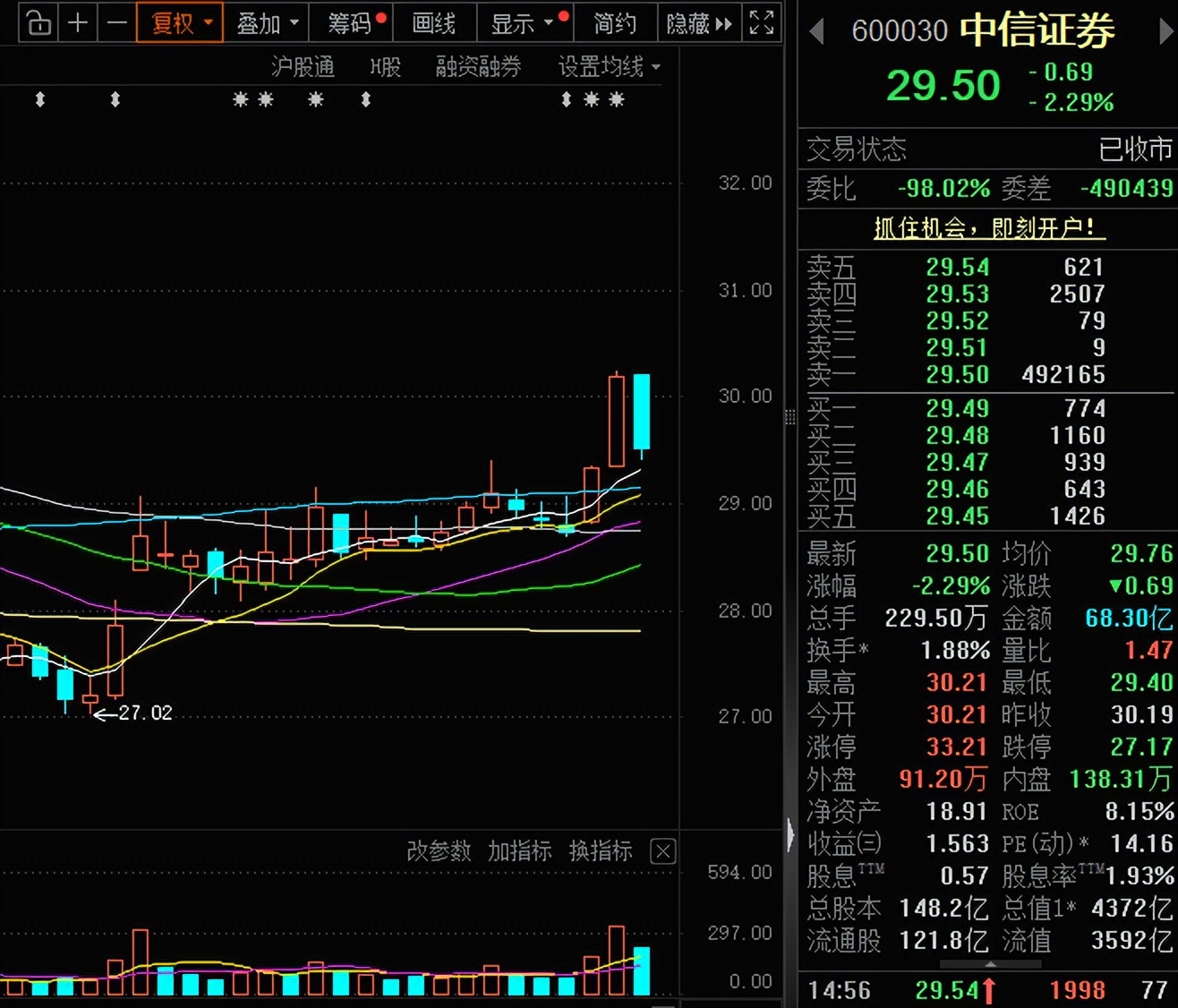 其中,中信证券A股“卖一”位置出现一笔49.22万手的巨额卖单。以中信证券当天29.50元/股收盘价计算,这部分压单约14.52亿元,而当日全天成交额为68.30亿元。