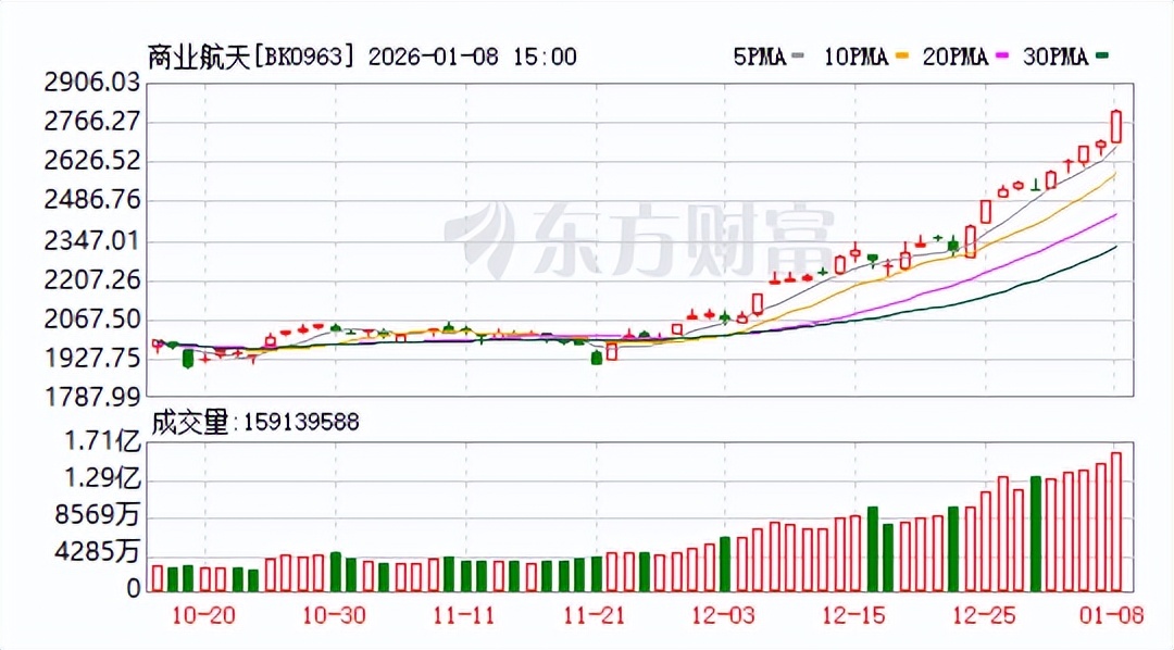 值得提醒的是,虽然上证指数收出15连阳,沪深两市成交也维持在2.8万亿附近,但是,如前所述,A股整个行情已经走到半山腰,热门板块更是涨幅较大。比如商业航天板块,自去年11月21日到今日收盘,累计涨幅42.42%。