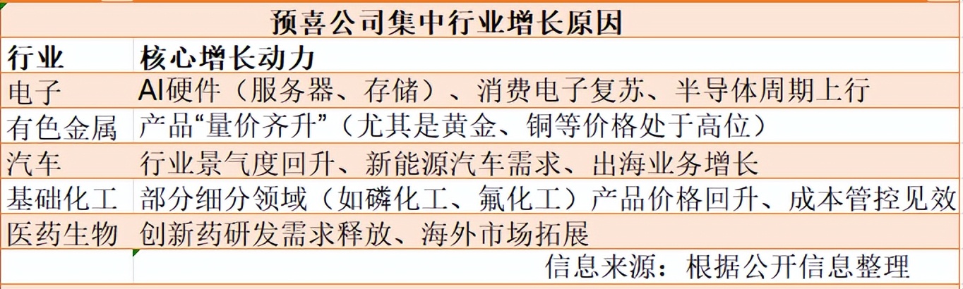 根据沪深两市业绩预告(尤其是2025年三季度及全年预告),A股预喜公司数量排名前五的行业是:电子、基础化工、汽车、医药生物、机械设备。这五大行业的预喜公司合计数量,占目前已披露预喜公司总数的近56.6%。这主要反映了上述行业上市公司基数大、景气面广的特点。