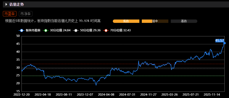 上半周,电网设备大热,有投资者在周二尾盘追进中国西电(601179.SH),第二天就被套。这哥们赶紧去查看电网设备整体市盈率。Choice数据显示,根据近5年数据统计,截至2026年1月22日收盘,该行业市盈率(TTM)45.57倍,比历史上99.6%时间都高。