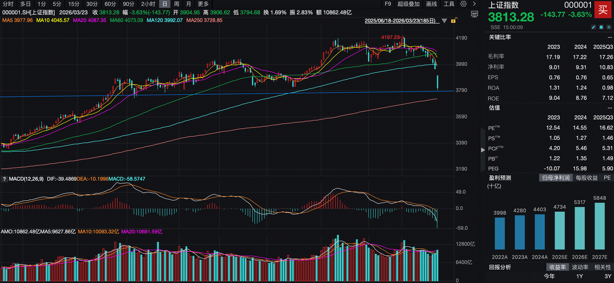 截至收盘,上证指数报收3813.28点,下跌3.63%;深证成指报收13345.51点,下跌3.76%;创业板指报3235.22点,下跌3.49% 。
