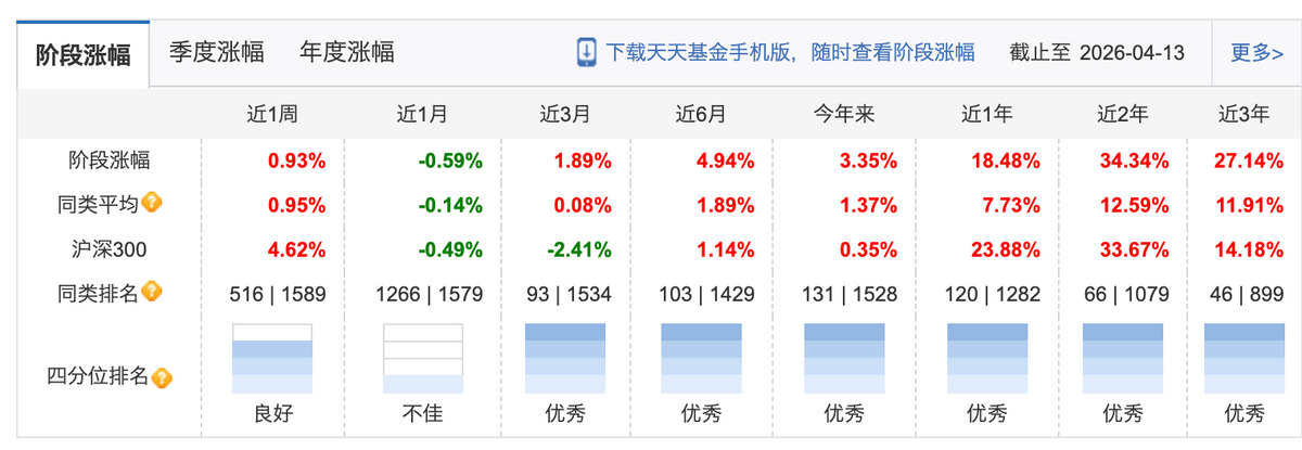 根据天天基金数据,截至4月13日,该基金今年以来净值增长3.35%,近1年涨幅18.48%,近3年上涨27.14%。