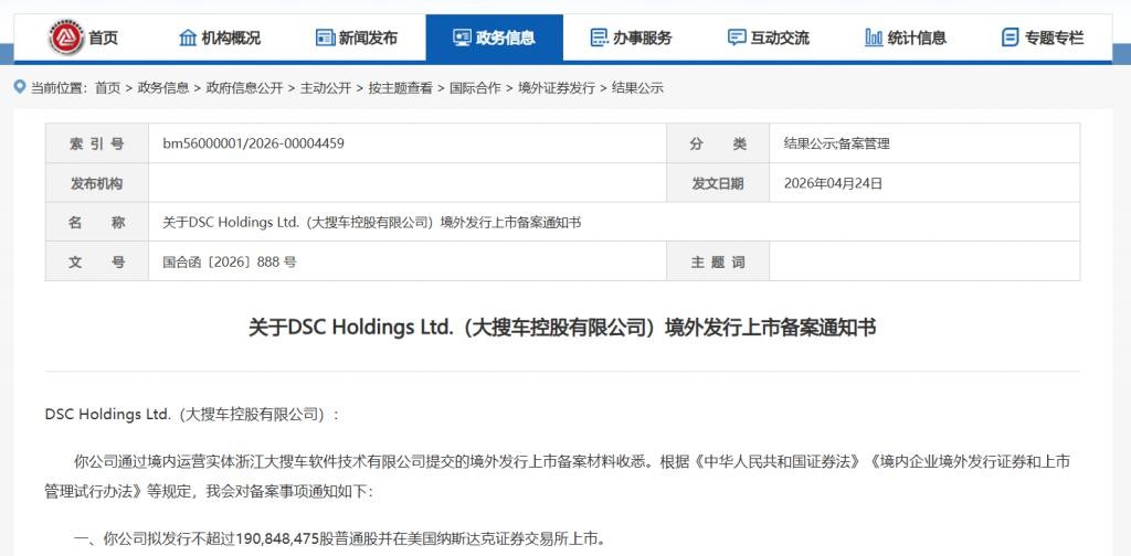 根据备案通知书,大搜车控股有限公司通过境内运营实体浙江大搜车软件技术有限公司提交备案材料,拟发行不超过190,848,475股普通股,并计划在美国纳斯达克证券交易所上市。