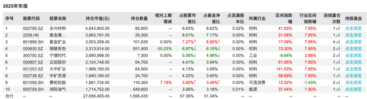 2025年末,富国资源精选的前十大重仓股仍然是较为典型的“大有色+资源”组合。