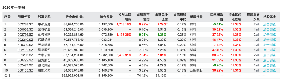 如果说2025年末的富国资源精选,还是一只“黄金、铜、铝、锂、油气兼顾”的传统资源主题基金;那么到2026年一季度末,它已经更接近一只“锂矿主题基金”。