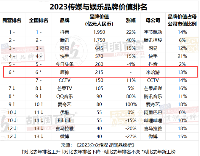 近日胡润研究院发布了《2023分众传媒·胡润品牌榜》。在这份榜单中,米哈游旗下的游戏《原神》首次入榜,其品牌价值为215亿元,位于总榜的第58位,民营品牌价值榜第33名,娱乐品牌价值榜第6名,并且《原神》是唯一一款上榜的游戏品牌。