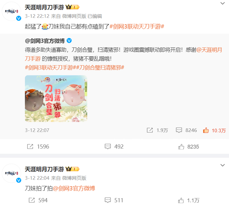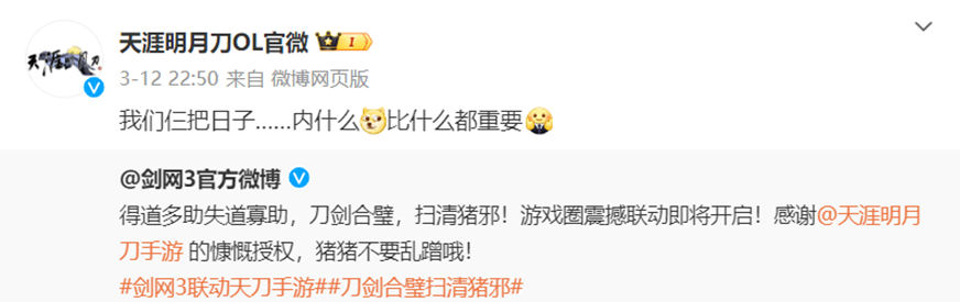 见网易游戏下场选手一个比一个猛,《剑网3》果断祭出大杀招:宣布联动《天涯明月刀手游》,“刀剑合璧,扫清猪邪”!天刀随即登上热搜。