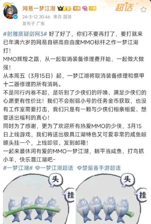 3月11日,《剑网3》发声宣布正式取消装备修理费,玩家们奔走相告。然而还没等《剑网3》高兴多久,就遭到了即将公测的网易《射雕》的一波“嘲讽”技能:“2024年了,竟然还有游戏修装备要收费?”
