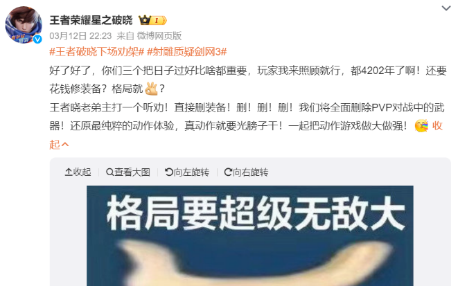 与此同时,在这场大战接近尾声的时候,竟然还惊动了王者峡谷。作为鹅厂手游二公子,腾讯《王者荣耀星之破晓》下场劝架主打一个“格局打开”——你们还在讨论修装备免费,我直接删装备!果然,最后出场的都是狠角色!