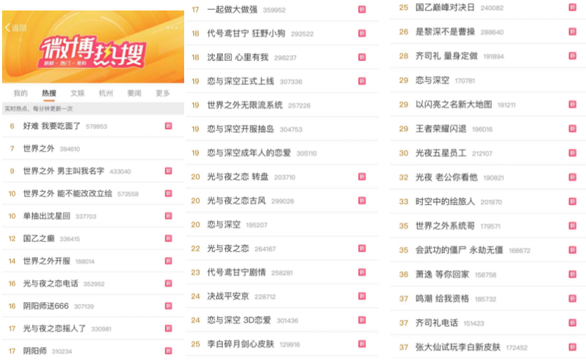 从结果上看,两次商战也有很多共同点,同样是各家“嫡出”游戏轮番制霸当天热搜榜、同样是一个游戏上新,多家友商轮番互动、错综复杂的喊话、联手,最终实现全员共享流量的集群效应,达成共赢。