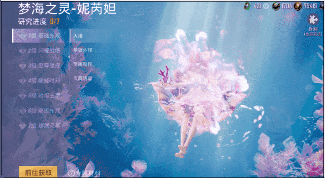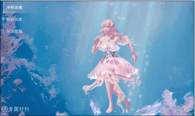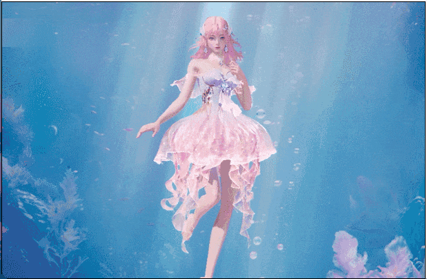 和名字相匹配,“梦海之灵-妮芮妲”的人设是一位海洋公主,身着以粉色为主色调的裙子,俏皮的风格下,外观最大亮点是做出了“呼吸感”——大厅以及专属动作能观察到裙摆上下漂浮,而奔跑状态下,裙子连接的丝带也会出现不同幅度摆动,就好像是一只真正的水母。