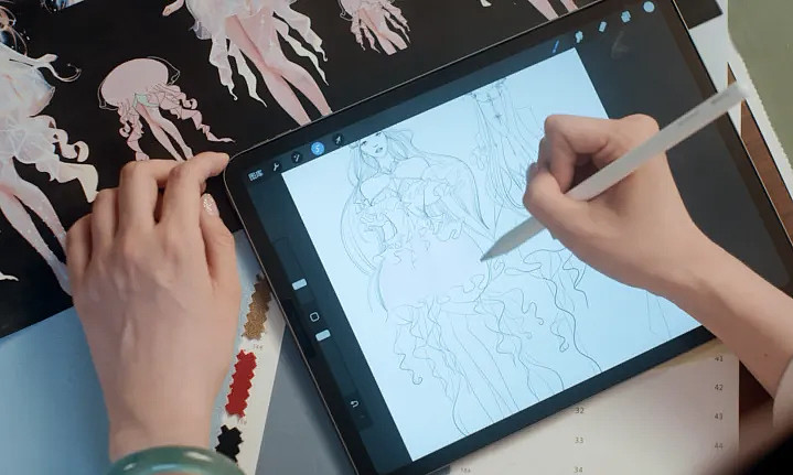 从纪录片中可以了解到,《和平精英》最初把灵感定位到了海洋、神话。蘭玉认为游戏外观和时装设计一样都是自我的投射,提出这件高定礼服可以用水母造型延展。