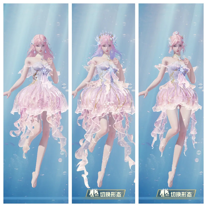 “梦海之灵”三个形态设计也各具特色,虽然都是“公主款”,但初级外观偏向青春、俏皮风,至臻外观则更偏向于高贵、优雅(不仅戴上了王冠,头发也变成了粉/紫/蓝渐变,且裙子有了更明显的金色脉络),而双生外观主要改变了发型,干练、自信感更突出。