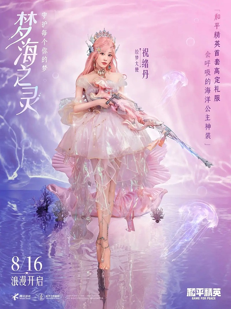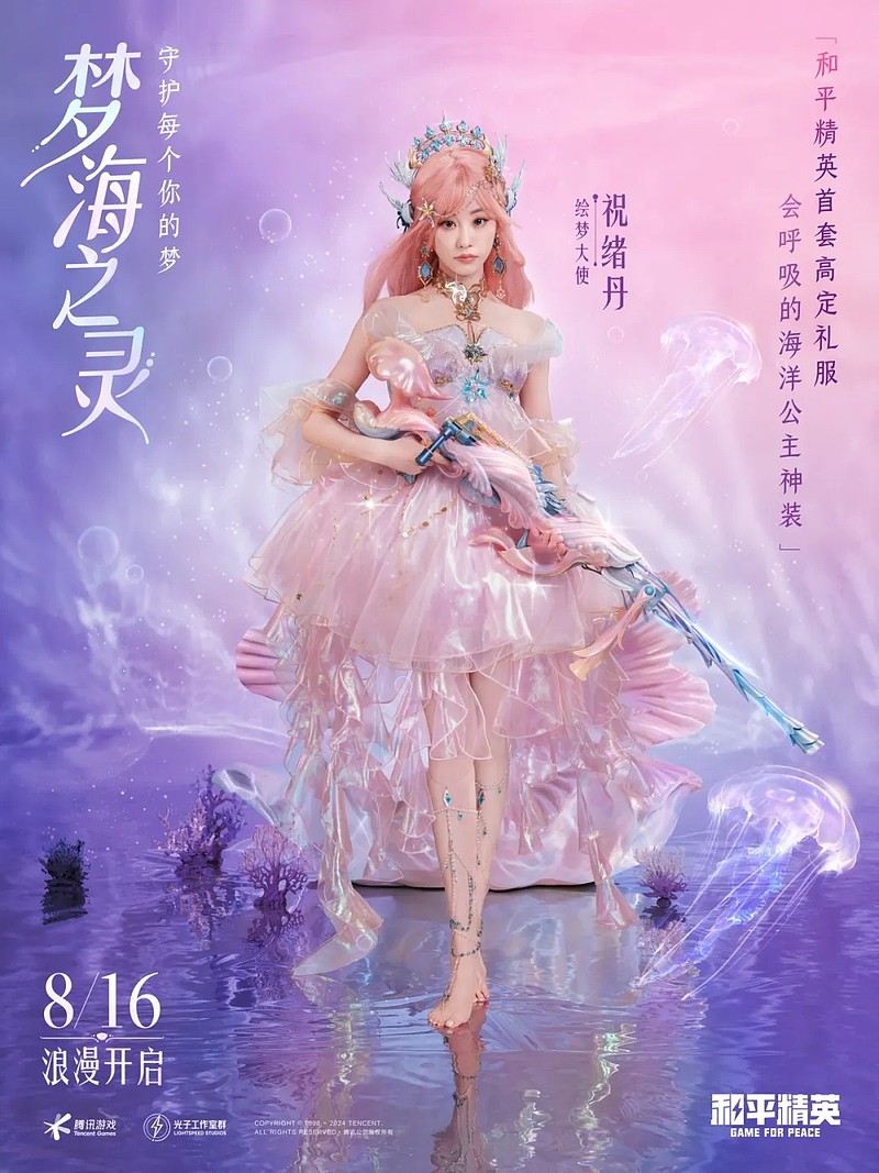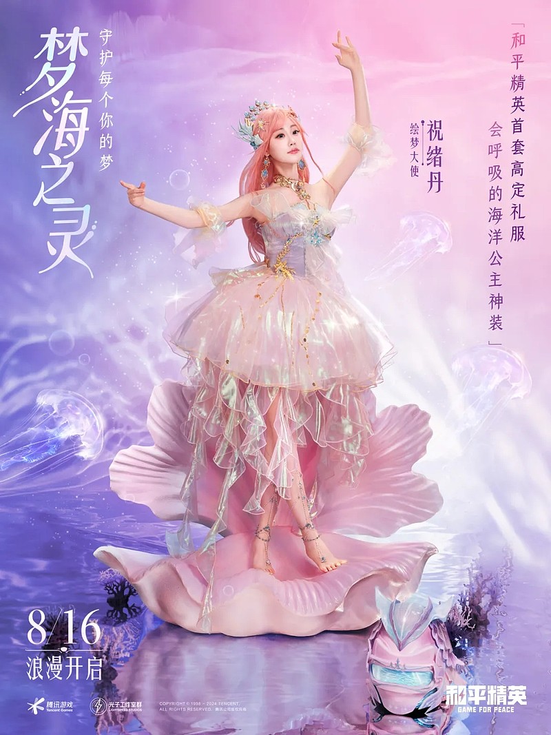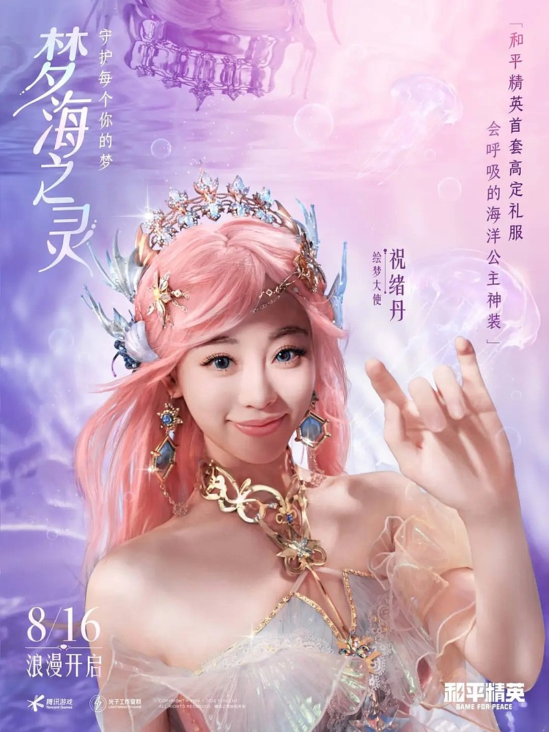 首先是强化皮肤的尊贵与梦幻属性,坐实“公主感”。为此,游戏邀请了人气女演员祝绪丹来具象化演绎梦海之灵-妮芮妲。祝绪丹最近在《狐妖小红娘》真人剧中扮演了御妖国公主布泰,外界标签印象本就非常匹配“梦海之灵”的公主人设。