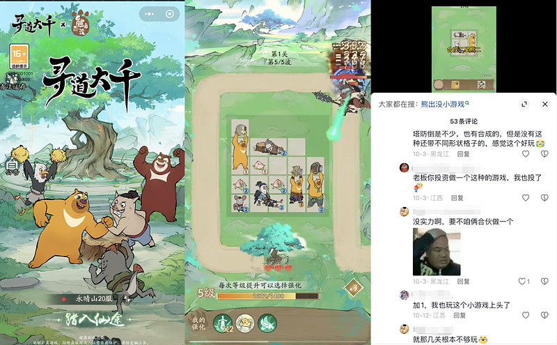 翻看当时网上视频的评论区,很多玩家在说该小玩法“上头”、“不够玩”,甚至不乏有玩家调侃“大家一起出钱做出来”。单这一环,就让玩家对熊出没联动有了深刻印象。