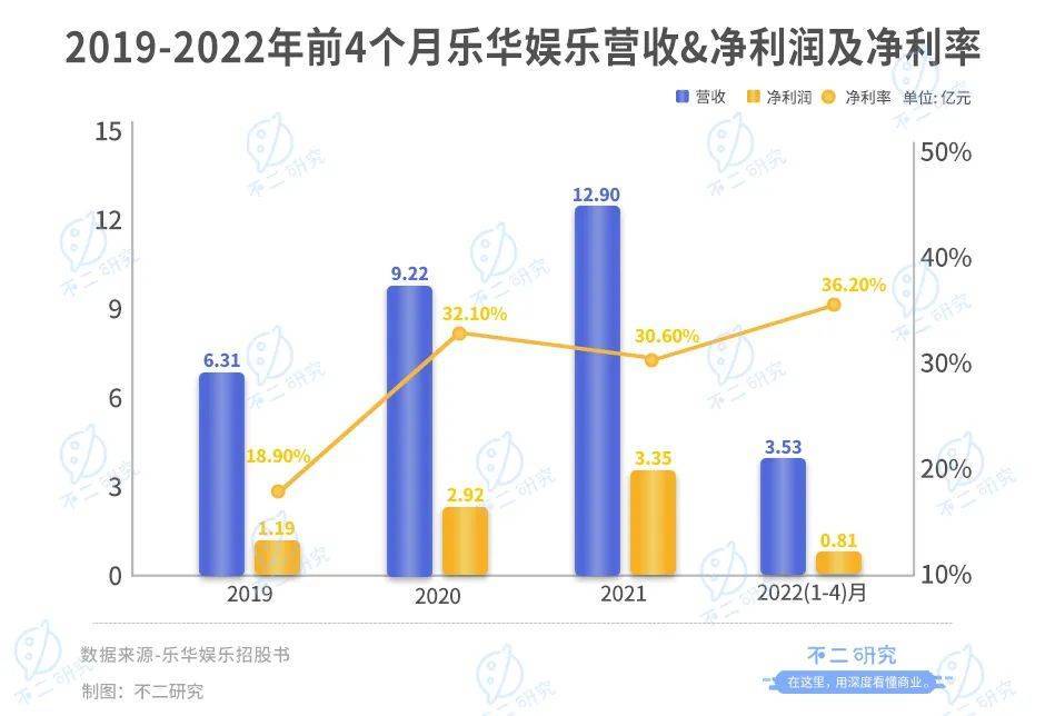 据招股书显示,2019-2021年及2022年前4个月,乐华娱乐的收入分别为6.31亿、9.22亿、12.90亿和3.53亿元,复合年增长率为42.96%。年内净利分别约为1.19亿、2.92亿、3.35亿和0.81亿元,净利率18.90%、32.10%、30.60%和36.20%。