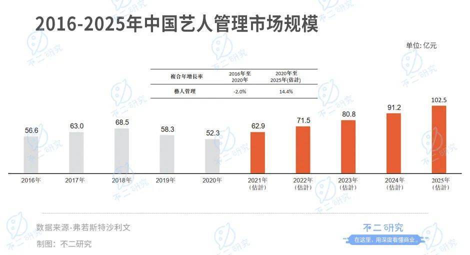 由于疫情影响,2019年中国艺人管理市场的规模开始呈走低趋势,由2018年的685亿元降至2019年的583亿元,2020年再降至523亿元。虽然在往后几年预计会有回升,但是疫情加之限薪令的影响,未来是否会有新的变化尚未可知。