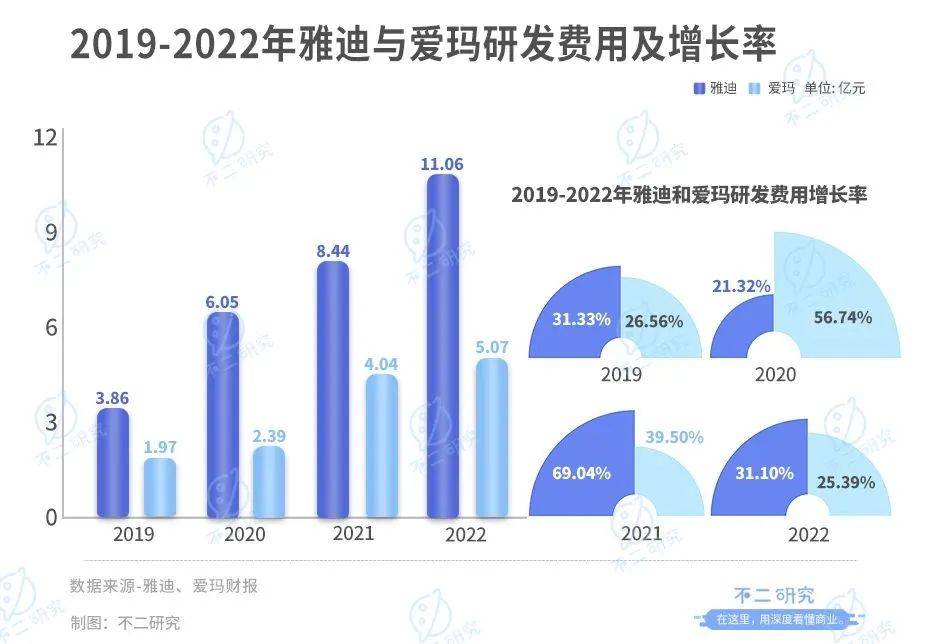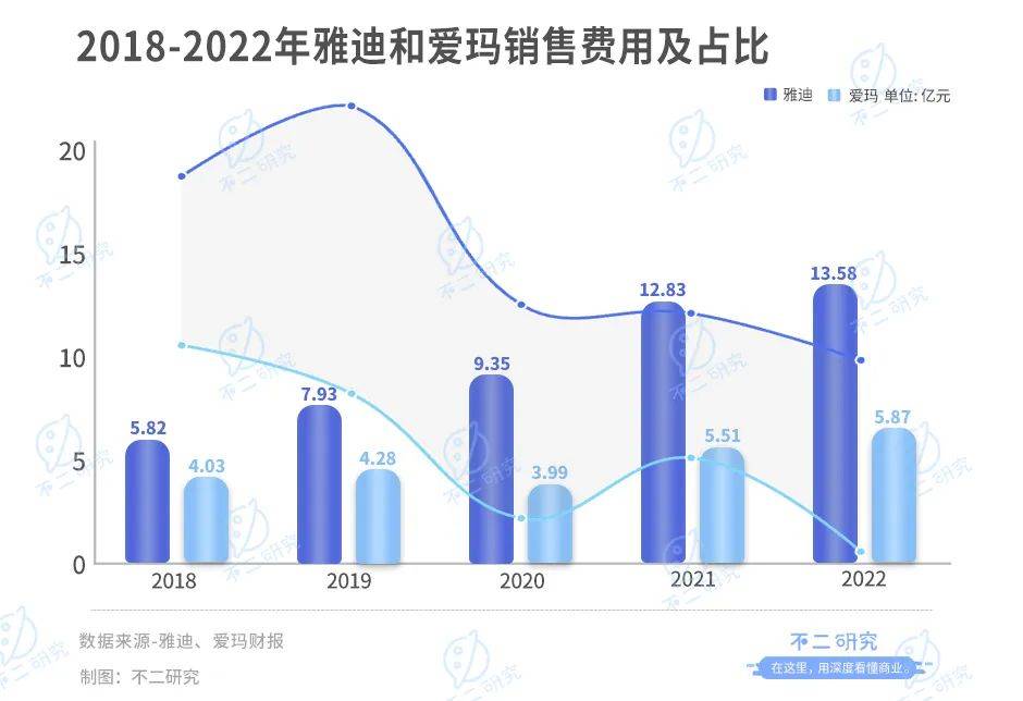 以2022年为例,雅迪的研发费用为11.06亿元,当期研发占比为3.56%;营销费用为13.58亿元,当期营销占比为4.37%。同期,爱玛的研发费用为5.07亿元,当期研发占比为2.44%;营销费用为5.87亿元,当期营销占比为2.82%。