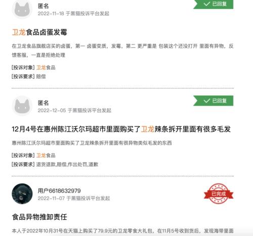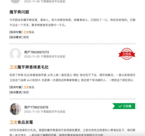 截至今年12月7日,在黑猫投诉上,消费者对卫龙的投诉量达到841条,投诉内容多以产品质量问题为主,近一个月内的投诉包括“卤蛋发霉”、“食品异物推卸责任”、“吃到塑料”、“吃到头发”等,涉及产品包括溏心卤蛋、魔芋爽、辣条等。