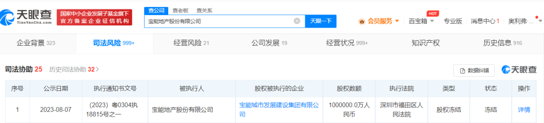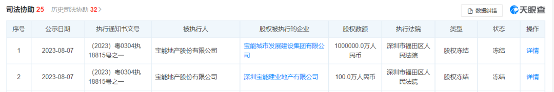 天眼查显示,宝能地产在2023年8月7日,新增两笔被冻结股权信息,被冻结股权数额分别是100亿元、100万元,执行法院均为深圳市福田区人民法院。