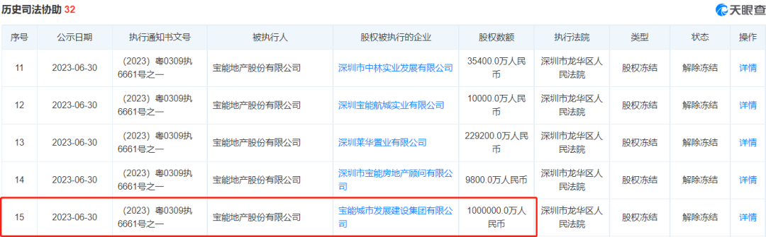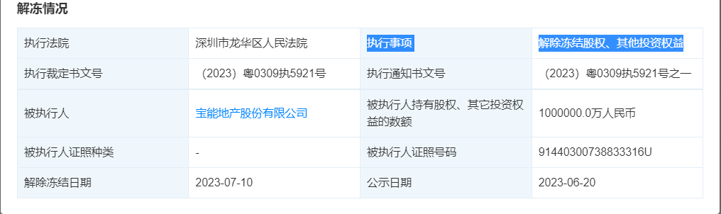 2023年7月10日,宝能地产的前两次冻结股权解除,执行事项均是“解除冻结股权、其他投资权益”。