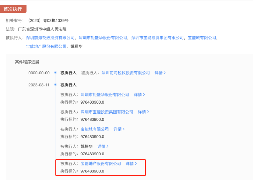 在宝能集团被列为被执行人信息中,大都会均涉及宝能地产。天眼查显示,8月11日,宝能集团、宝能地产、姚振华等新增一则被执行人信息,执行标的9.76亿元。