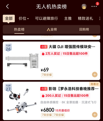 另外,截至1月4日,在京东无人机热卖榜TOP30中,影翎A1排名第27位,榜单大多被大疆产品霸占;在天猫无人机热销榜中,TOP20中未见到影翎A1的身影。