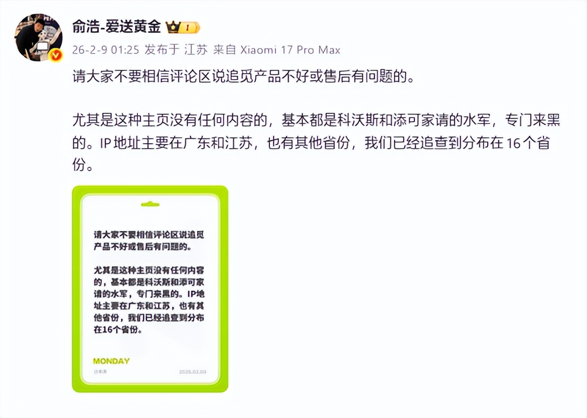 他强调:“尤其是这种主页没有任何内容的,基本都是科沃斯和添可家请的水军,专门来黑的。IP地址主要在广东和江苏,也有其他省份,我们已经追查到分布在16个省份。”