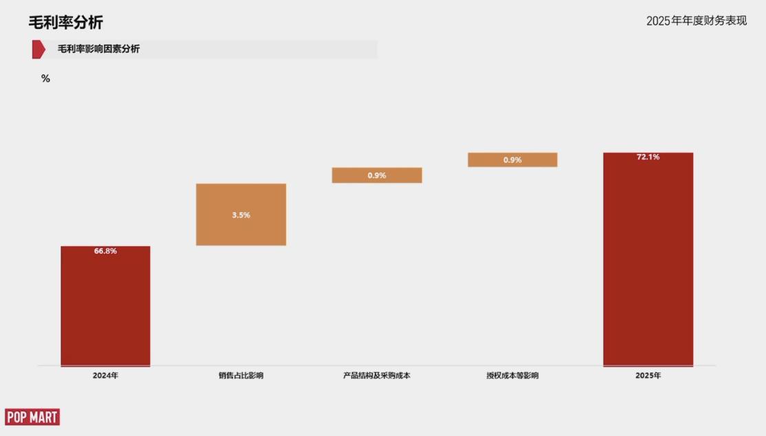 据管理层披露,泡泡玛特毛利率从2024年的66.8%提升至72.1%,其中授权成本等进一步下降使毛利率提高了0.9%。相对比,同为潮玩企业TOP TOY2024年毛利率为32.7%。