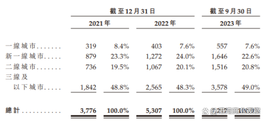 门店数据具体来看,报告期各期,沪上阿姨于三线及以下城市门店数量分别为1842间、2565间、3578间,占比分别为48.8%、48.3%、49.0%;二线城市门店占比分别为19.5%、20.1%、20.8%;新一线城市门店占比分别为23.3%、24.0%、22.6%。
