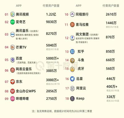 根据金十数据统计的2022年Q2国内「知名APP付费用户数量」,18个入选的APP中有11个是文娱内容平台,长视频、音频、音乐、阅读平台均有上榜。