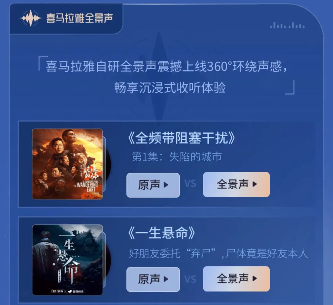 8月,《李昌钰·罪案剧》第四季、《一生悬命》、《流浪地球》等适配AudioVivid标准的全景声有声剧上线,其中,豆瓣高分悬疑作品《一生悬命》收获了近百万次的播放量。