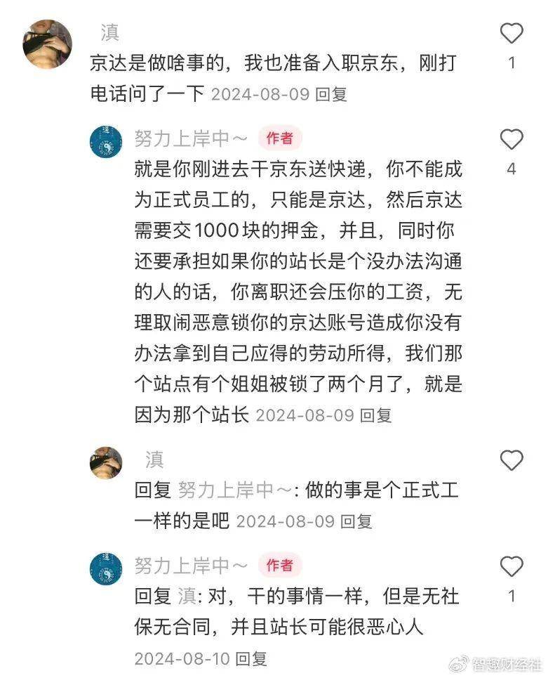 有网友公开评价:“京东也想学顺丰,只学到了给自营快递员上五险,工资全部来源于送件,没有保底工资。大概看自营开销太大了,弄出了许多京XX的外包劳务公司,跟外卖员一个性质。赶上活动以单价高忽悠生人入坑,活动结束限单,俗称卸磨杀驴。”