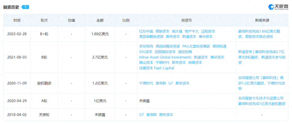 继Robotaxi之后最受瞩目的干线物流场景里,专注卡车自动驾驶的擎天智卡于今年敲响丧钟,曾被称为自动驾驶第一股的图森未来今年5月也收到了纳斯达克的停牌通知,天眼查APP信息显示,专注国内智卡的明星玩家赢彻科技,同样自去年2月的B+轮融资后,再未获得新一轮融资。