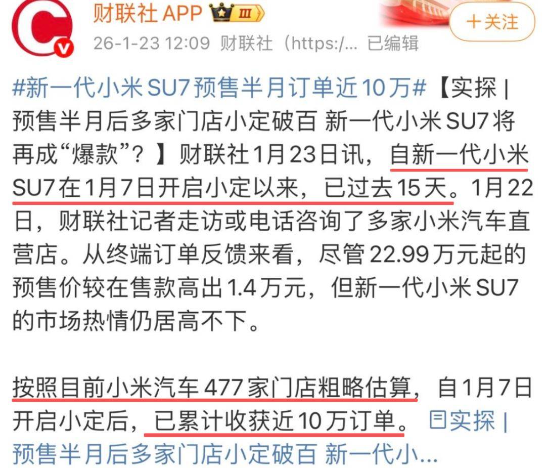 根据财联社1月23日的报道,新一代小米SU7已经累计收获接近10万订单。