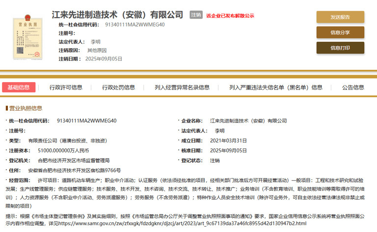 近日,国家企业信用信息公示系统显示,蔚来与江淮汽车合资成立的江来先进制造技术(安徽)有限公司(下称“江来公司”)登记状态变更为“注销”,该公司已于9月5日完成注销程序。