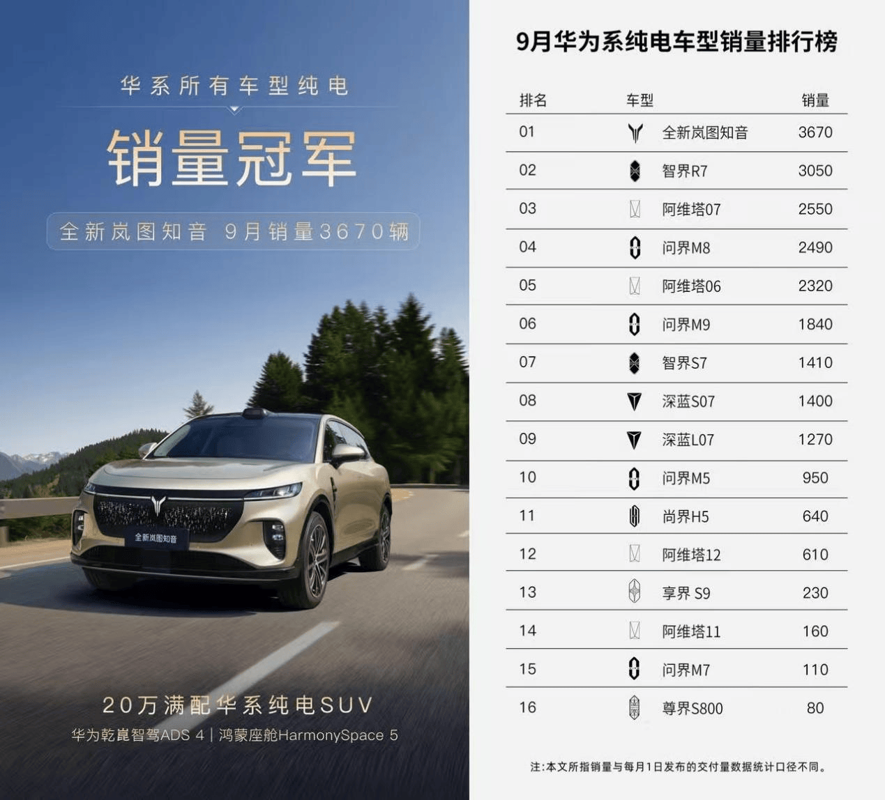 全新岚图知音的市场表现,足以用四个字来形容:不负所望。9月,其以3670辆的销量成绩,成为华为系所有车型中纯电车型销量冠军。