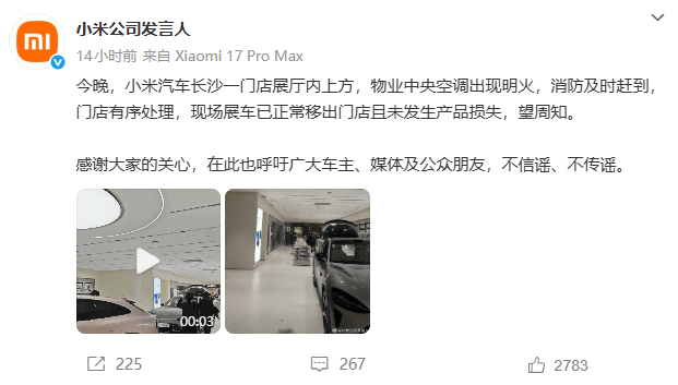 据“小米公司发言人”11月20日晚在微博平台发布声明称,当晚长沙一家小米汽车展厅突发火情,网传“展车起火”消息不实。经核实,火源来自展厅上方的空调设备,消防人员及时赶到处置,现场展车已安全移出门店,未发生任何产品损失。