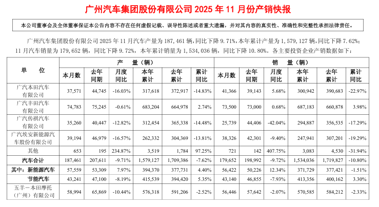 近日,广汽集团发布2025年11月产销快报,11月汽车销量为17.96万辆,同比下降9.72%;2025年1-11月累计销量达153.4万辆,同比下滑10.8%。